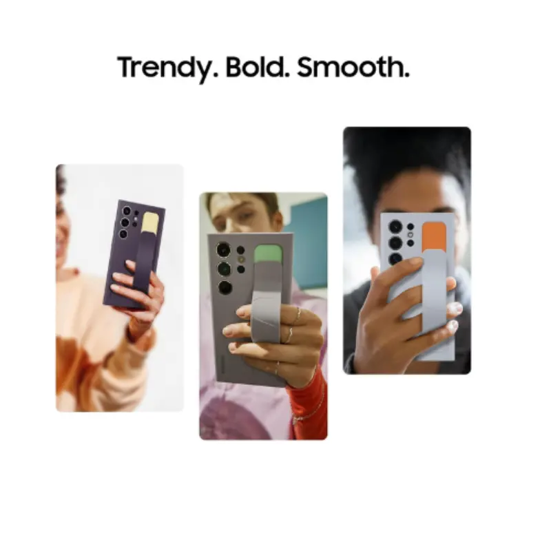 عصري. عريض. ناعم: تتميز حافظة Galaxy S24 Standing Grip بملمس ناعم لا يقاوم، مما يمنحك قبضة مريحة ناعمة الملمس؛ تحتوي الحافظة أيضًا على مادة صديقة للبيئة — مما يوفر الحماية لغرض¹