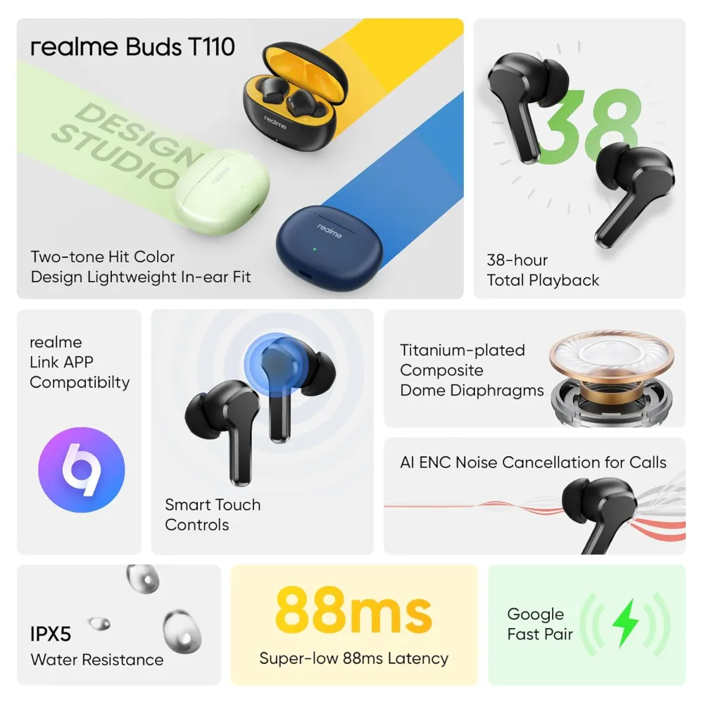 سماعة realme Buds T110 بتقدملك مكالمات أوضح بفضل AI ENC، وبطارية قوية لحد 38 ساعة مع شحن سريع وتصميم مريح للاستخدام اليومي.