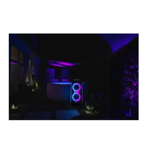 - قم بإقران مكبري صوت عبر الكابل أو لاسلكيا بواسطة تقنية True Wireless Stereo (TWS) للحصول على صوت أكبر وأكثر جرأة واصطحب الحفلة إلى أي مكان بفضل المقبض سهل الإمساك والعجلات التي تعمل بسلاسة