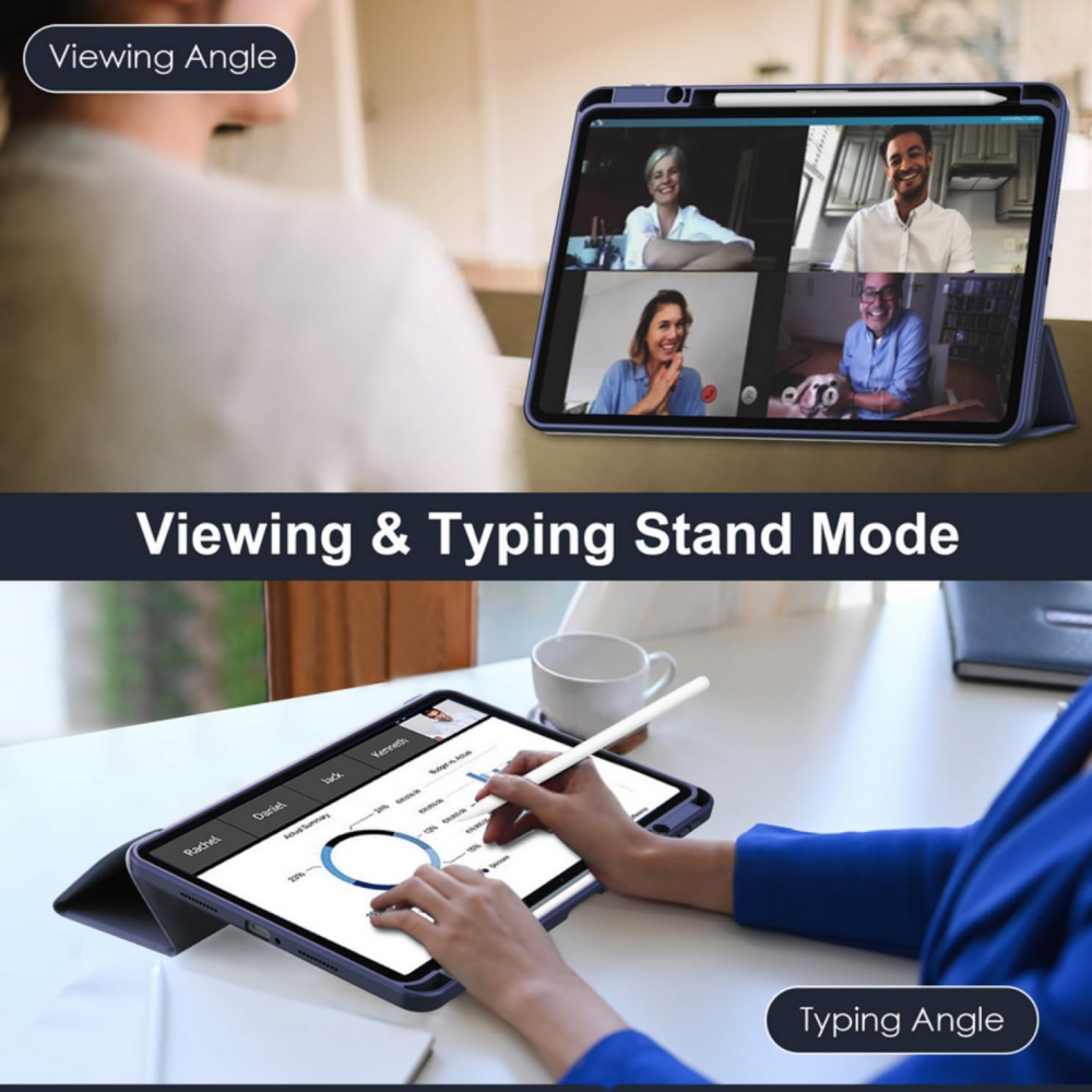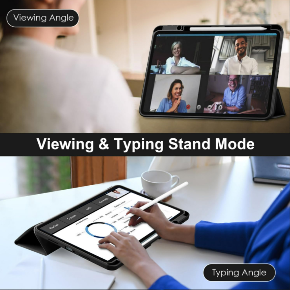 يتميز التصميم الرقيق المقاوم للصدمات بحماية قوية وخفيفة الوزن دون إضافة حجم زائد. كما توفر الحقيبة وظيفة الوقوف لتعديل زاوية اللوح لمشاهدة مريحة أو كتابة أسهل، بينما يتيح ميزة Auto Wake/Sleep تشغيل الجهاز أو إيقافه تلقائيًا عند فتح أو غلق الحقيبة، موفرًا للبطارية وسهولة الاستخدام.