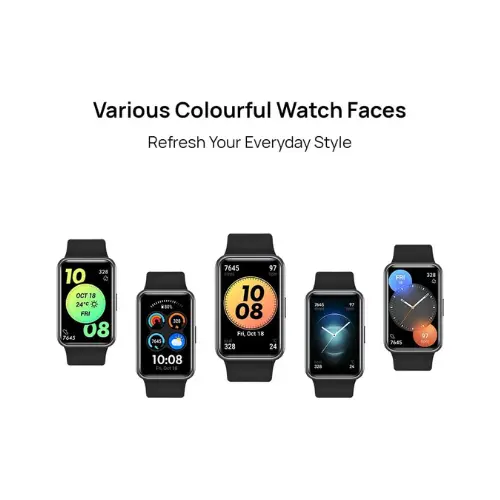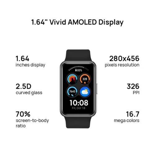 • تتميز الساعة الذكية Huawei Watch Fit الجديدة بشاشة AMOLED مقاس 1.64 بوصة ودقة تبلغ 280 × 456 بكسل، وتوفر تجربة مشاهدة واسعة للغاية وواضحة. الآن مع ضبط السطوع التلقائي وستة وجوه للساعة تعمل دائمًا.