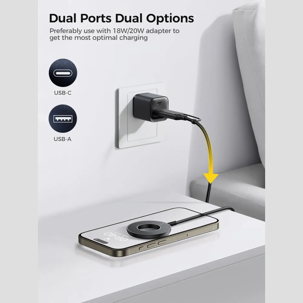 يُعد شاحن JOYROOM JR-WQM03 المغناطيسي تحفة فنية في عالم الشحن اللاسلكي. يتميز بتصميمه المفرغ والفريد الذي لا يضفي لمسة جمالية مستقبلية فحسب، بل يعمل بفعالية على تبديد الحرارة لضمان بقاء هاتفك بارداً أثناء الشحن السريع. الشاحن مزود بمغناطيسات N52 قوية جداً تلتصق فورياً وبدقة بخلفية أجهزة الآيفون لتوفر شحناً بقدرة 15 واط. ما يميز هذا الإصدار هو دعمه لمنافذ إدخال مزدوجة (USB-C و Lightning)، مما يعني أنه يمكنك استخدامه مع أي كابل متاح لديك. بفضل هيكله المصنوع من سبائك الألمنيوم المتينة والكابل المجدول فائق القوة، يمثل JR-WQM03 الخيار الاحترافي الذي يجمع بين القوة، الأمان، والتصميم العصري المبتكر.