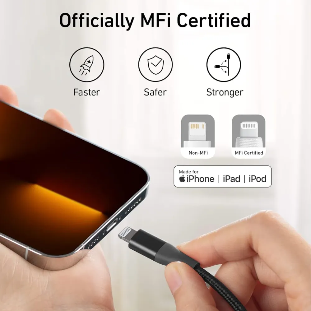 يُعد كابل Anker Powerline+ II الجيل المطور والأقوى في عالم كابلات الشحن، حيث تم تصميمه ليكون الكابل الأخير الذي تشتريه. أثبتت الاختبارات المعملية قدرته على تحمل أكثر من 30,000 طية، مما يجعله مقاوماً للقطع والتشابك والشد العنيف. طوله البالغ 10 أقدام (3 أمتار) يمنحك راحة لا مثيل لها، حيث يمكنك استخدامه على الأريكة أو في المكتب بعيداً عن مقبس الحائط بكل سهولة. الكابل حاصل على شهادة MFi من شركة آبل، مما يضمن توافقاً تاماً وشحناً آمناً وسريعاً لجميع أجهزة آيفون، بما في ذلك إصدارات Xs و XR و X والموديلات الأقدم. يتميز بغطاء من النايلون المجدول المزدوج الذي يجمع بين المظهر الفخم والتحمل الصناعي، ليكون الخيار المثالي لمن يبحث عن الجودة والاعتمادية.