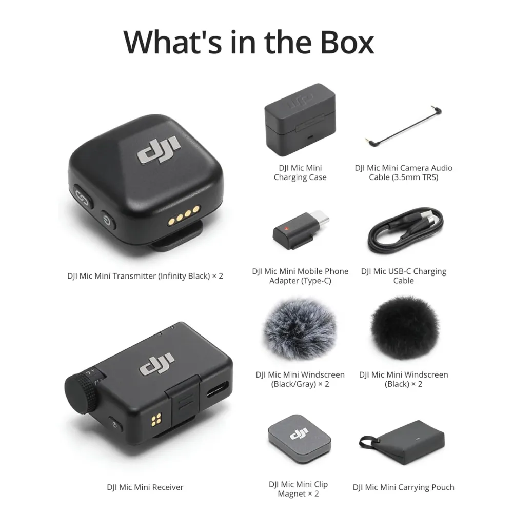 Take your audio quality to the next level with the DJI Mic Mini. This compact wireless microphone system with dual transmitters, one receiver, and a sleek charging case delivers clear, professional sound—perfect for content creators, vloggers, and interviews on the go.