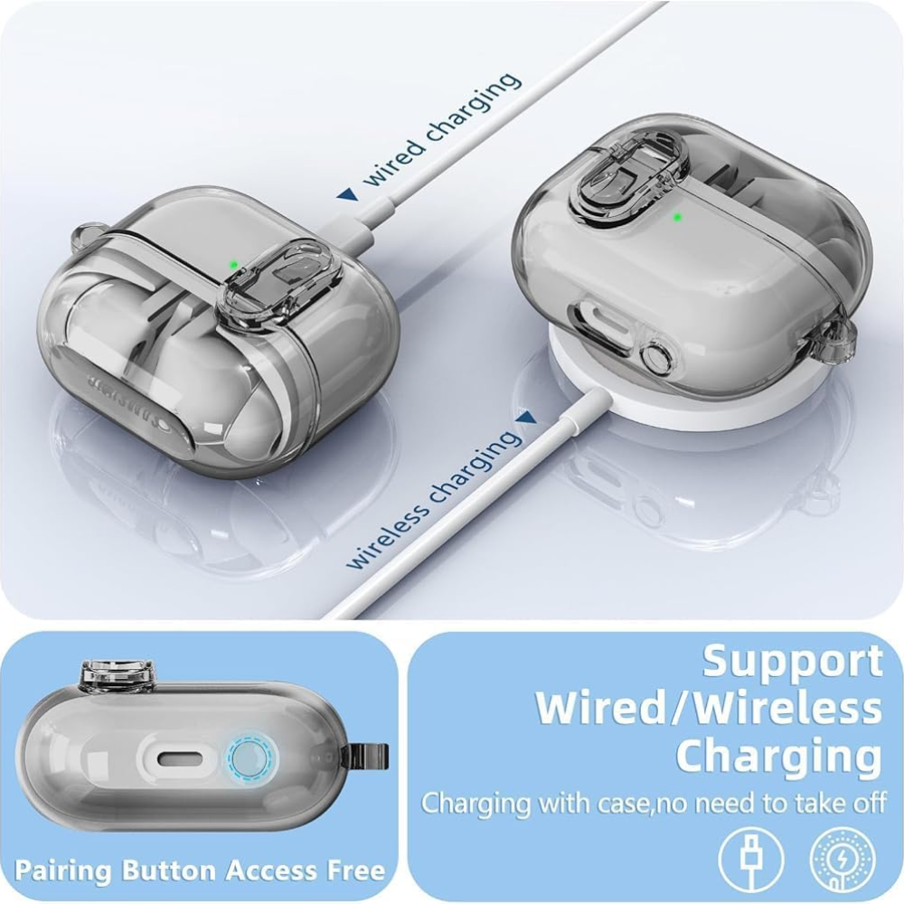 GQ Airpods Transparent TPU Protective Cover Men Women with Carabiner(Clear Black)