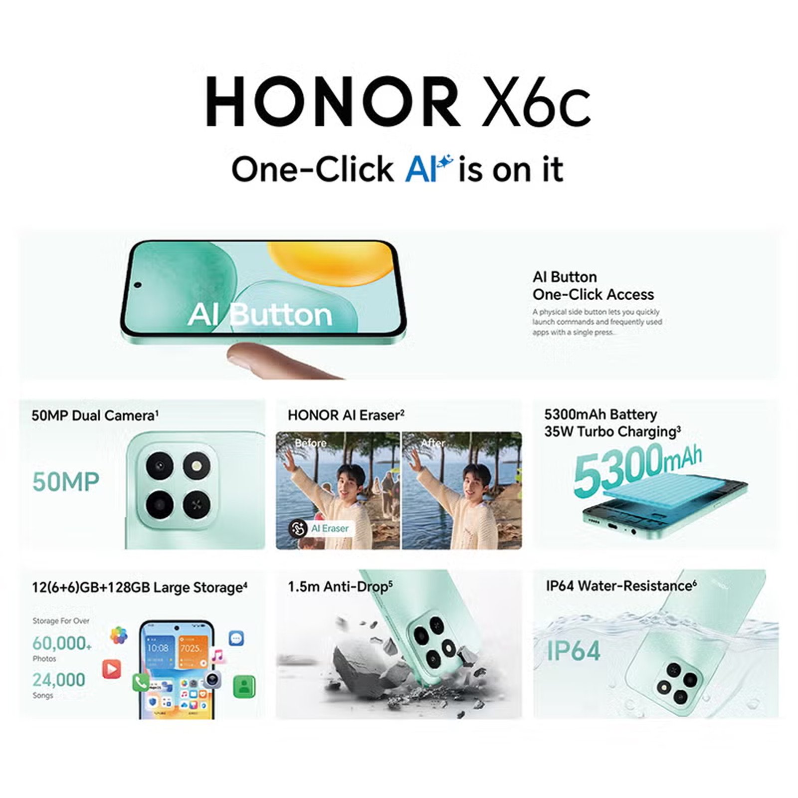 The HONOR X6c is the perfect choice for those seeking a practical phone that combines durability with reliable performance. It features a massive 5200mAh long-lasting battery, a smooth 90Hz refresh rate display, and a 50MP camera to capture your favorite moments. It’s the phone that gives you power and ease for everyday use with a modern touch.