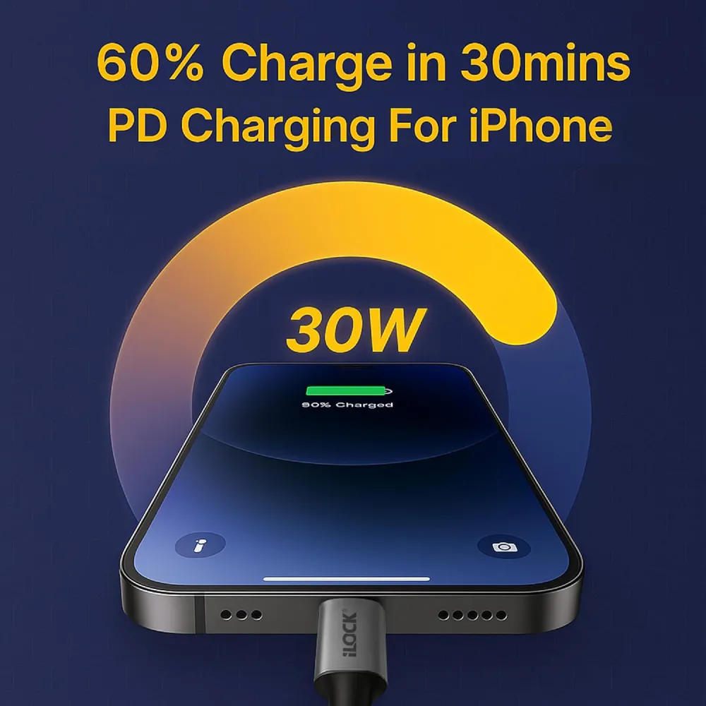 The iLOCK USB-C to Lightning cable is the ultimate charging companion for iPhone and iPad users who demand both speed and reliability. Supporting up to 30W Power Delivery, it can fast-charge your compatible iPhone from 0% to 50% in just 30 minutes. Engineered with premium high-density nylon braiding, it resists tangles and survives heavy daily use without fraying. Reinforced stress points at the connectors ensure long-term durability, making it the perfect upgrade from fragile original cables. Whether you are at home, in the office, or traveling, iLOCK provides a secure, optimized connection for both high-speed charging and efficient data syncing.