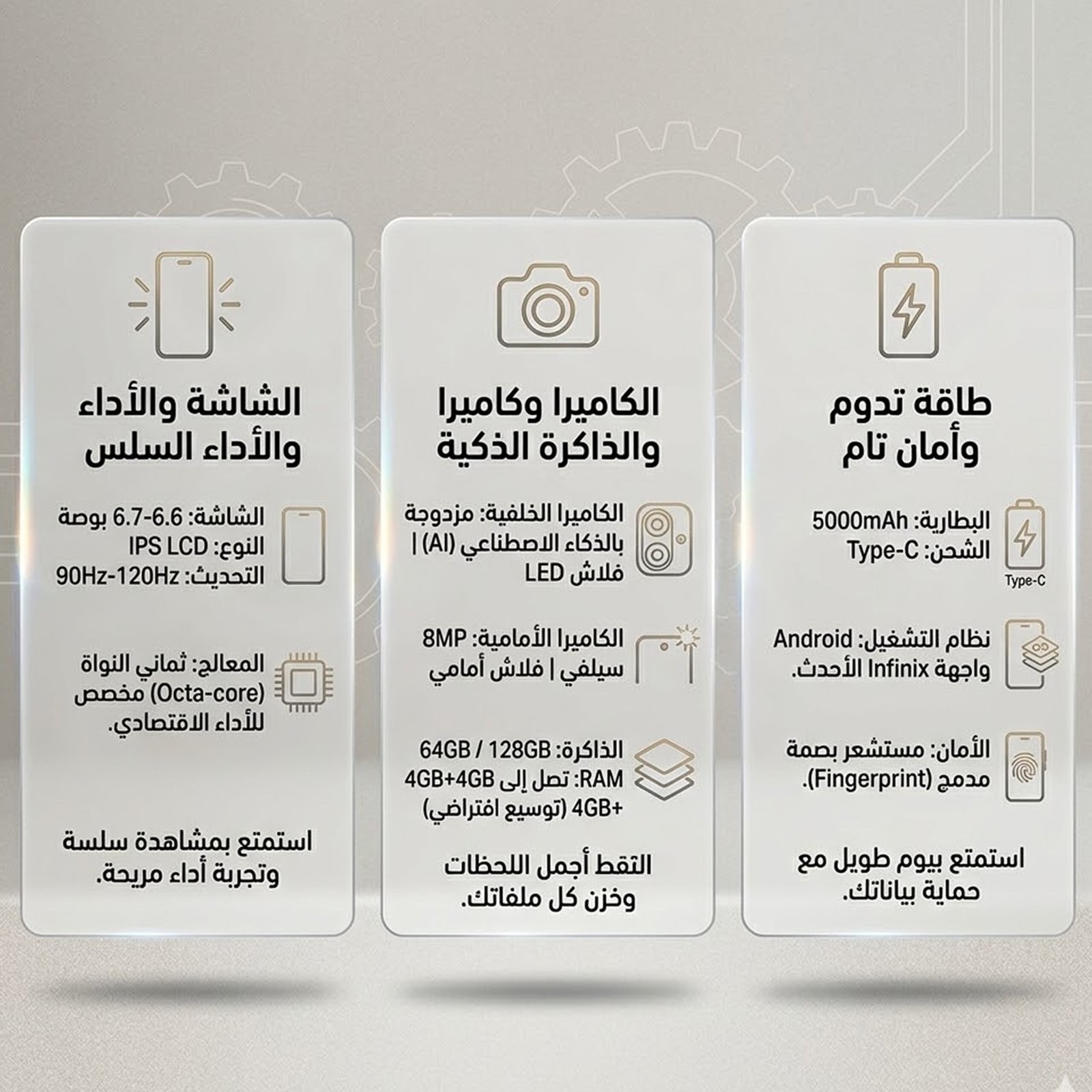 The Infinix Smart 10 is the ultimate everyday companion, blending an immersive high-refresh-rate display with a massive, long-lasting battery. Designed to deliver stable performance and a sleek aesthetic, this smartphone offers smart features that make your mobile experience smoother and more enjoyable.