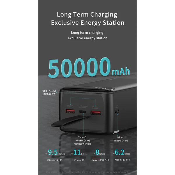 Huge Capacity: 50,000 mAh is enough to charge your smartphone, tablet, or any other electronic device multiple times.