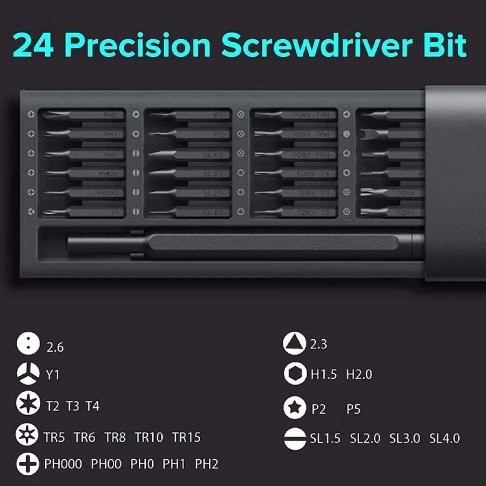 A compact and versatile precision screwdriver set featuring 24 magnetic bits, perfect for repairing electronics, phones, watches, glasses, and other small devices with ease and accuracy.